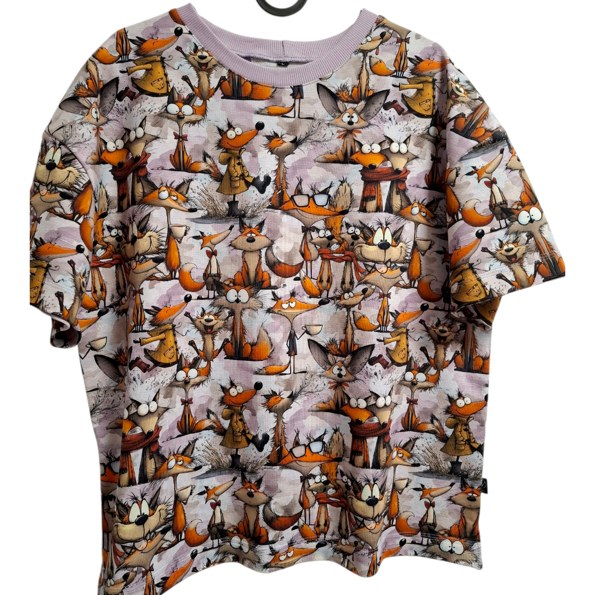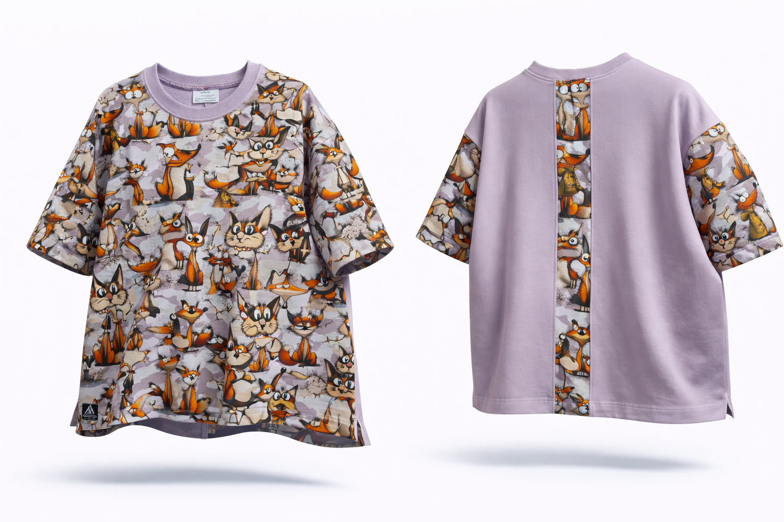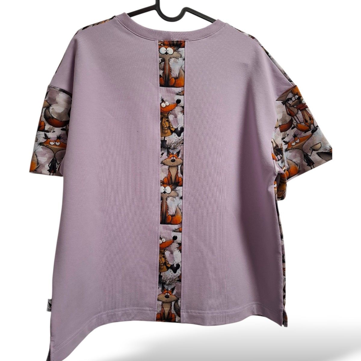 Stilingas moteriškas oversize džemperis–maikutė su išskirtiniais spaudiniais ir dekoratyvine nugaros detale.