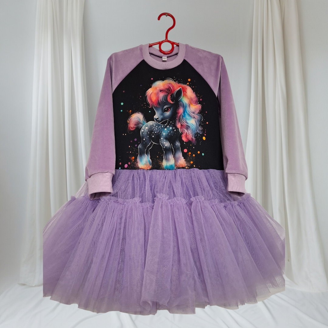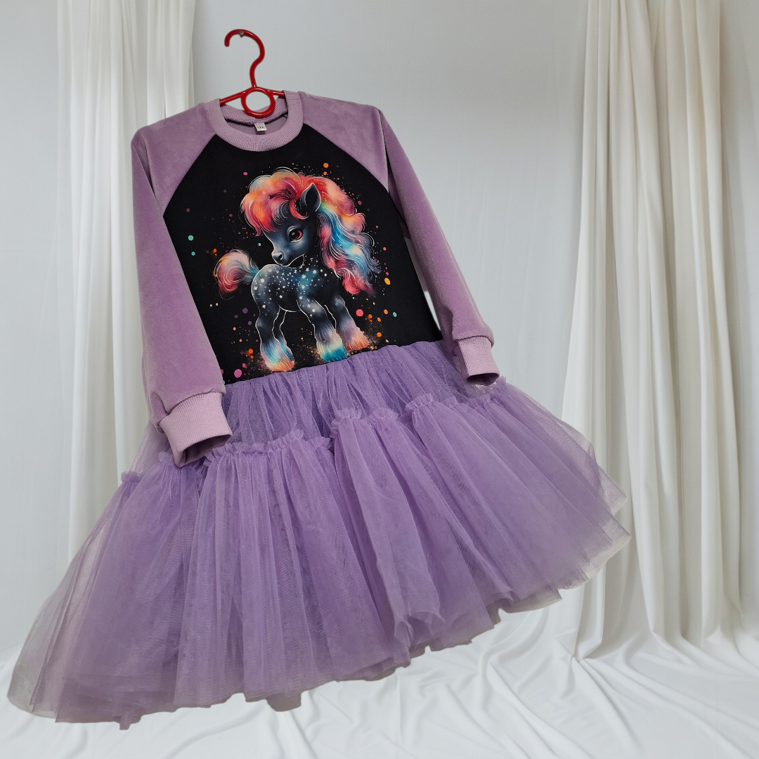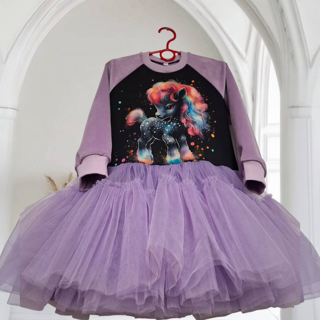 Išskirtinė suknelė mergaitėms su magiško ponio motyvu. Minkštas natūralus ir veliūro trikotažas, purus tiulio sijonėlis sukuria patogų, bet ypatingą įvaizdį šventėms ir gražioms kasdienos akimirkoms. ✨🦄