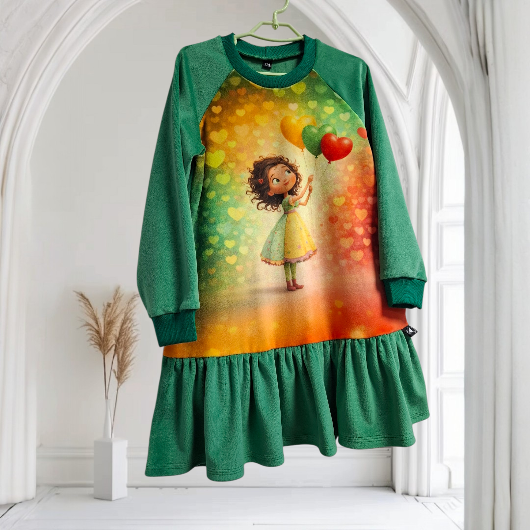 Švelni veliūrinė suknelė, alsuojanti jaukumu ir vaikystės svajonėmis 💚✨ Minkštas, malonus prisilietimui audinys švelniai apgaubia ir leidžia jaustis laisvai 🤍 Spalvinga, pažangia skaitmenine spauda atgyjanti iliustracija pasakoja mažą istoriją apie džiaugsmą, drąsą ir svajones 🎈💫 Suknelė toms akimirkoms, kai norisi šypsotis, suktis ir tiesiog būti savimi 🌈💛