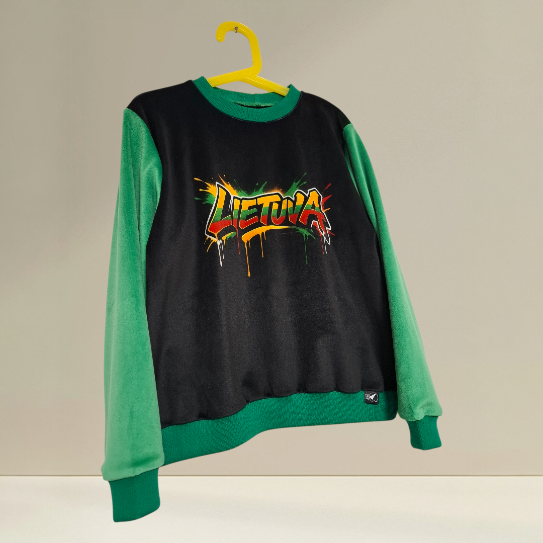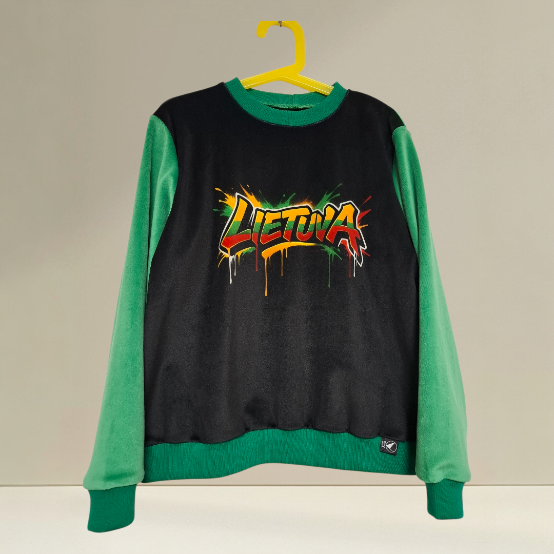 Minkštas veliūrinis džemperis su laisvu, platoku unisex siluetu. Patogus ir jaukus, su išraiškingu lietuvišku akcentu – tinkamas tiek kasdienai, tiek šventei.